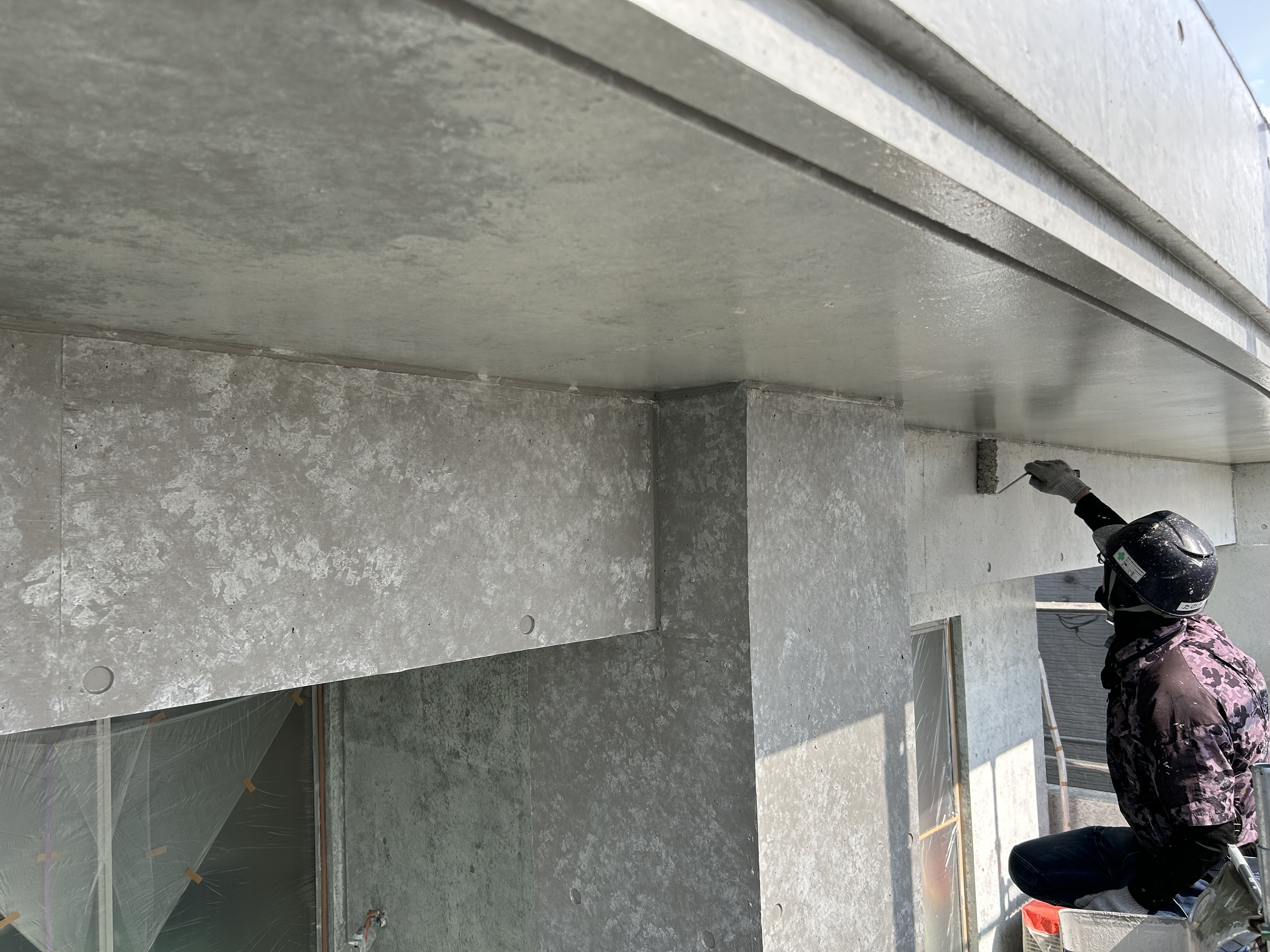 グレー系の塗料をバランスを見ながらランダムに模様付けしていき、コンクリート調により近づけるための施工を行います☺